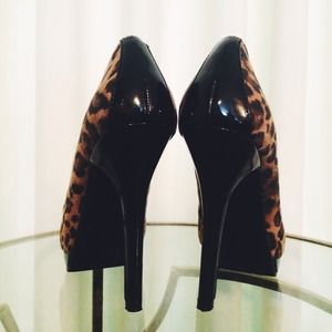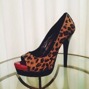 BCBG Paris leopard open toe pumps. 4 1/2" heels with 1" platform. Sexy red color blocking at the toe. Black strip extends up through to the top at the back of the heel. All man made materials. Worn once or twice. Open to offers!