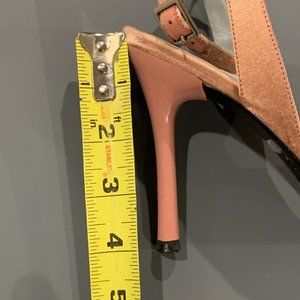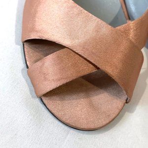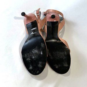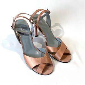 - Strappy pink sandals, more light pink than were photographed. Shiny satin finish with about 3" heel. Would be great for vintage dressy event or weddings.