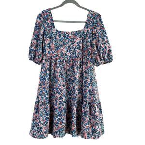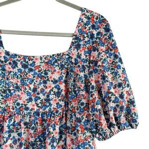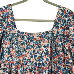Features: square neckline, short puff sleeves, square back with tie-back detail, short tiered swing silhouette, chiffon material, zipper back closure, fully lined. Color: blue and pink ditsy floral print.