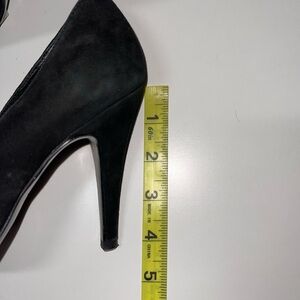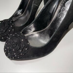 BCBG Paris black studded appliqué heels. In excellent condition! Rounded toes. Large rose shaped appliqué with silver studs on the toes. Slip-on style. 4.5” stiletto heel. Suede upper. True black color. Size 6.