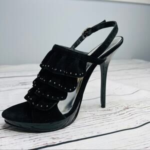 BCBG Paris leather upper ruffle with metal silver accent NEW without tags. Suede feel material. Platform. New without tags. Size 7
