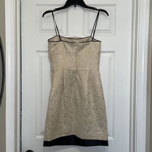 BCBG Paris Gold with black trim cocktail mini dress, size 4. Excellent used condition. Beautiful gold shimmer dress with black adjustable straps. Black trim at hemline. Care & content tags in photos.