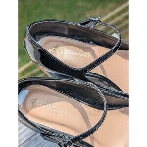 BCBG Platform Heels Black Patent Leather Buckle Strap 8.5 Women's Cyber Goth