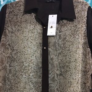 BCBG printed button down top, sheer, brown. Great with jeans or slacks. For the office or casual, light and comfy. New never been used. With tags