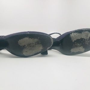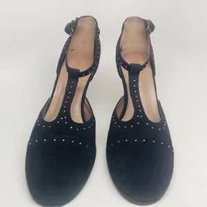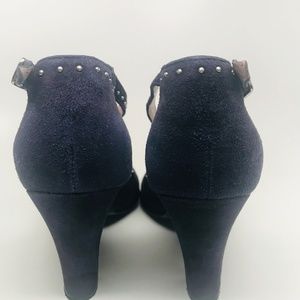 BCBG Purple Suede Bradipo-S T-Strap Pump with rounded toe and gold stud detailing. 3.5" stacked heel. Minor flaw on one heel (see detail photo).