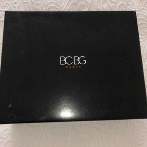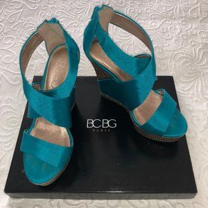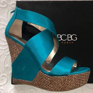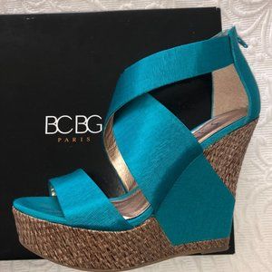 BCBG RANDO Platform Wedge Heel Sandal Teal Fabric Jute Trim Back Zip Sexy 8