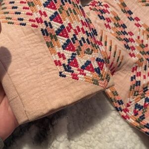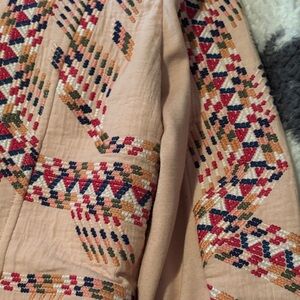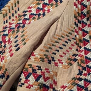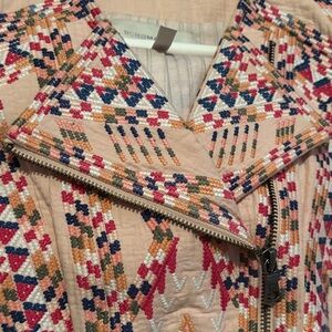 Elegant blazer with intricate geometric embroidery. Features a sleek zip front. Perfect for adding flair to any outfit.