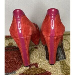 BCBG Red Velvet And Fuchsia Patent Leather Platform Heels.