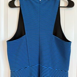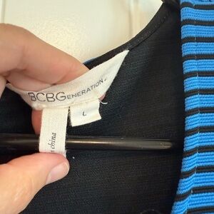 BCBG Royal blue and black striped modern swing dress a-line women's size L. Note there's a tiny mark on the front (pictured).