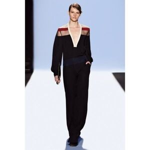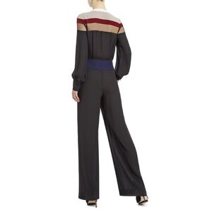 BCBG Runway Avi Jumpsuit. Lending you exquisite shape, this blouson-sleeve jumpsuit is a bold way to elevate your look with ease. V-neckline. Blouson sleeves. Color-blocking.