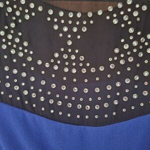 BCBG Max Azria Runway blue and black colorblock dress in size 4. This tailored dress features embellished detail at the neckline and bodice and a mid-thigh length. Perfect for cocktail events, holiday parties, or as a wedding guest dress. From a smoke-free, pet-friendly home. Dry clean only. Excellent pre-owned condition. No visible flaws. 100% polyester.