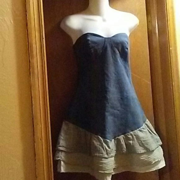 This is a stylish cute and flirty strapless denim dress with faux buttons lining the back and it has an invisible zipper on the side