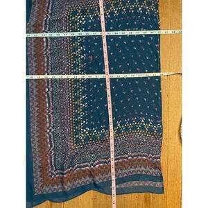 BCBG Max Azria sheer caftan haftan blouse with brown leather belt. Marked size XS. Blue with pink and orange geometric tribal print pattern.