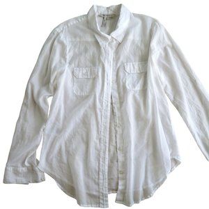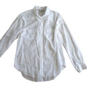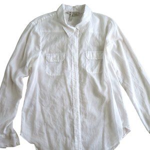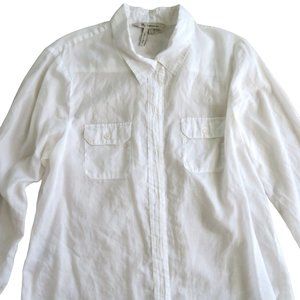 BCBG Sheer White Cotton Blouse Large Button Up Roll Tab Long Sleeves