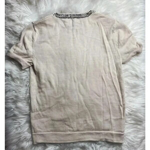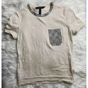 BCBGMAXAZRIA cream colored lightweight short sleeve sweater. Size XXS. This top is embellished around the neckline and chest in the shape of a faux breast pocket. Embellishments are silver/gray/gun metal. This shirt has a few flaws: hole on one sleeve, some discoloration at neckline and light piling. Price reflects.