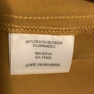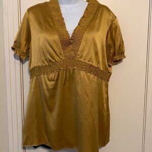 Very beautiful color combined with the shine will make this a show stopper, ruching at neckline, waist and sleeves, deep V neckline, has a tag attached and looks new, soft flowy silk with slight stretch