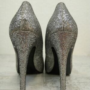 BCBGeneration Women's Parade Pump, Silver/Candie Glitter heels size 10B. EUC with a few spots along the rim where some of the silver has faded. Those areas are shown in the photos. The heel is 4.5" and the hidden platform is .5". These shoes will look nice with a party dress or dressed down with some jeans and a cute top. Related: BCBG, BCBG Pumps, platform pumps, glitter pumps, silver heels, New Years Eve, party, nightclub
