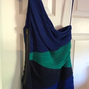 BCBG one shoulder short ruched color block dress in shades of blue. Super flattering fit. Perfect for a wedding or cocktail event. Worn one time.