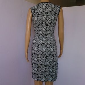 This great dress duo are from BCBG/BCBGMaxAzria and are in great shape. The first is from BCBGMaxAzria a print of varying shades and sizes of blue, green, and white stripes with a V neckline on the back and front. The second is a BCBG dress and is a faux wrap style dress with a V neck, a faux knot detail below the bust, and black piping along the seams. The fabric print is a black fabric with a light sky blue print of hibiscus flowers and palm fronds on it.
