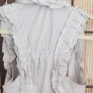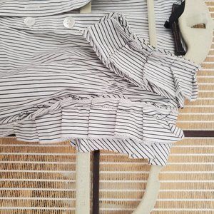BCBG black and white striped sleeveless button down top. This features a ruffle trim around the arms and the collar and has a racerback style back. Perfect for a night to day look. Although it is an XXS, it is very flowy and could probably fit up to a size S.