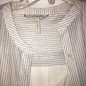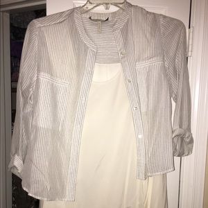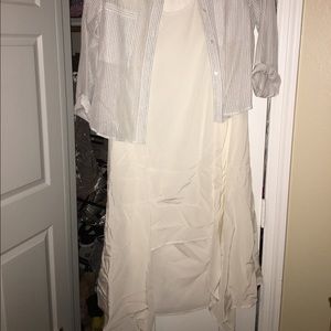 This piece is from the BCBG Runway Collection. It has a pin stripe button up shirt with a built in asymmetrical slip dress. This is a one of a kind. Very bohemian, perfect for vacationing or just everyday life!