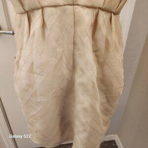 BCBG Strapless Cream Mini Dress. NWT. Size 6. Double lined. Bustier top. So saucy. Zips down back to below waist and has the upper double clips. Form Fitting. No slits. Material: 100% Polyester. Measurements: Pit to Pit: 15 inches. Top of dress to bottom: 27.75 inches. At waist: 13.5 inches. Smoke free home. No odors. All offers are welcome. No rips/stains/tears. Thank you! Cream color with a bit of gold shimmer in the light.