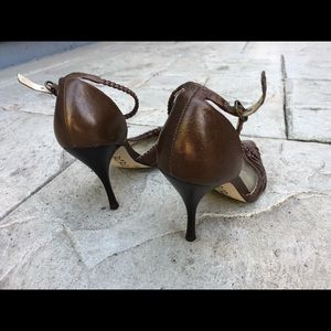 Closed toed for the office, wedding party or out with the ladies 🌺 great condition. Slight bronze shimmer; braided ankle straps. Approx 3.5 inch heel height. I wish this color matched my closet!! Tiny white chip on outside of left shoe as shown in second photo.