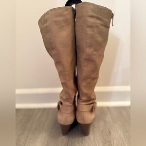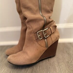 Step out in style with these chic tan wedge boots. Perfect addition to your fall/winter wardrobe.