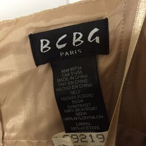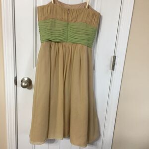 Stylish BCBG dress with a tan body and green waistband. Sleeveless design with a pleated top.