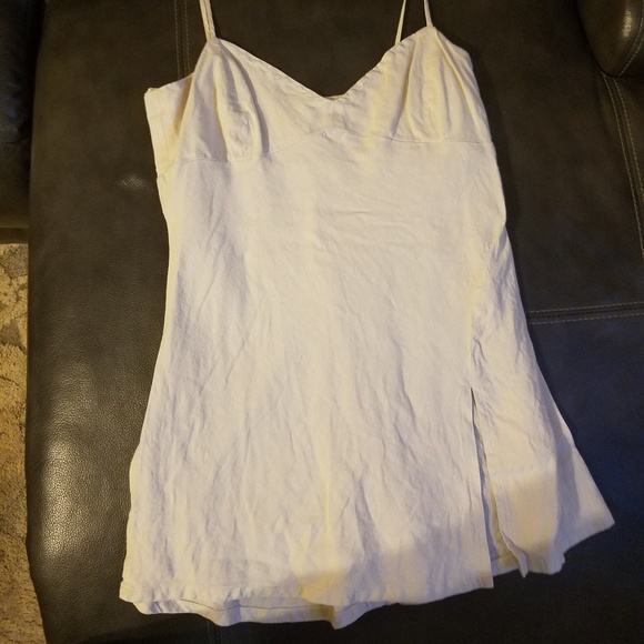 Hi - this looks cute. Can you tell me the fabric content and the bust measurement please? Is it longer? Hard to tell the exact silhouette - does it have a slit on one side? Lined? LOL, Thanks for your help :)