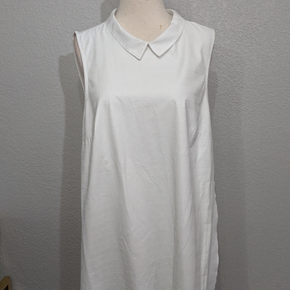 This long white tunic is easy to throw on with a pair of leggings and black flats for a casual pulled together look. It has a small Peter pan style color. The front is a white faux-leather and the back is cotton. It has long splits on the side.
