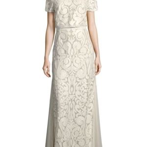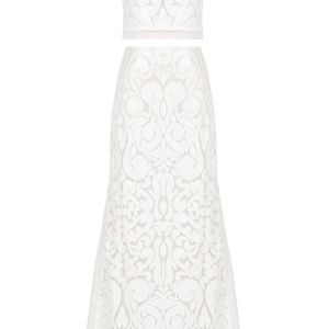 Make an elegant entrance in a contemporary, short-sleeve crop top and floor-sweeping skirt adorned with embroidered sequins for a glamorous finish.