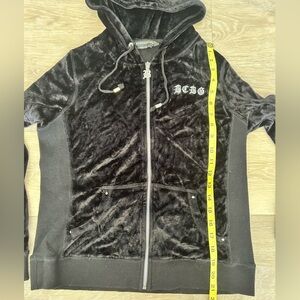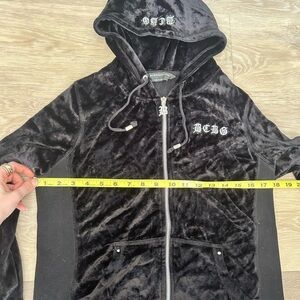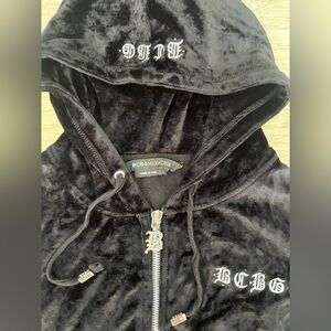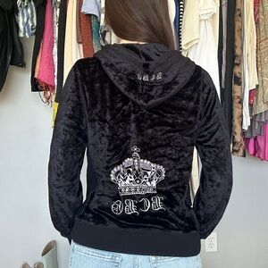 Black crushed velvet zip-up hoodie with gothic BCBG embroidery and large crown graphic on the back. Juicy Couture era vibes, soft + fitted, perfect with denim or mini skirts.