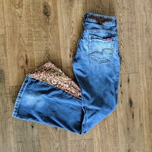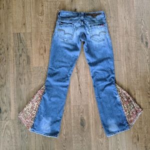 Medium Wash vintage inspired Bell bottom jeans with Paisley fabric
