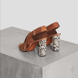 Bring a touch of urban chic to your look with these open-toe sling back sandal designed in soft leather and accented with a python embossed block heel. US size 6