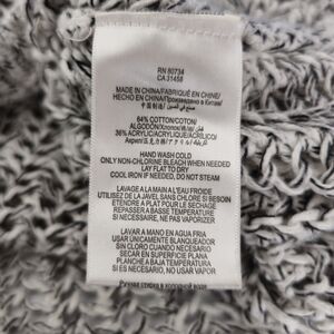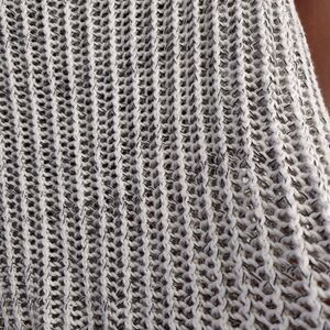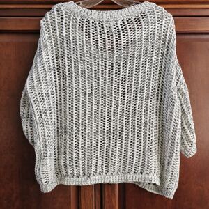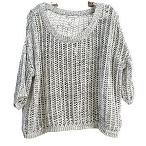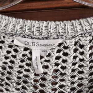 This BCBGMAXAZRIA sweater is a modern and minimalist pullover style in size XS. It features an open-knit design with a boat neck and 3/4 sleeves. The color is white and black it is made from a blend of polyester and cotton materials. The sweater has a solid pattern and a contemporary look with open knit accents.