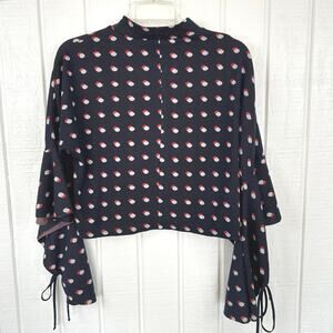 BCBG Women Cropped Flared Long Sleeve Knit Polka Dot Sweater Navy Blue Medium