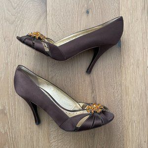 BCBG Womens 7 Heels Brown Satin Peep Toe Formal Dressy Crystal Amber Gold