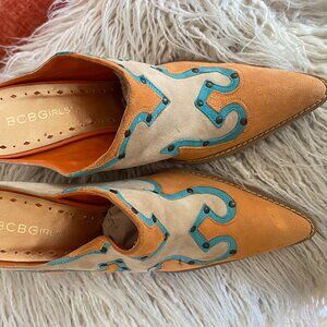 BCBG Womens's Sz. 6.5B Western Style Slide Mule Heel Shoes Multicolored, wedge style heel, material feels like suede, turquoise and light peach, and tan.Condition is very good.