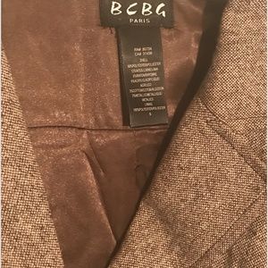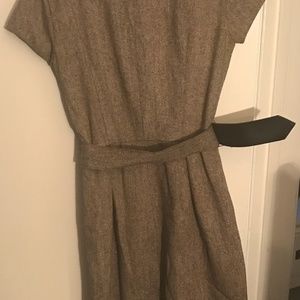 Size 6 - twice worn BCBG work dress. Dark brown underlay with gold shimmer so it adds some sparkle to a professional outfit. Comes with a belt. Made from Polyester, wool, acrylic and rayonne so it has a bit of weight to it, perfect for the fall.