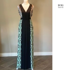 This BCBG snakeskin print and color blocked maxi is your go to for dressing up for an evening date or dressing down with a leather jacket and cool black combat boots. The material is a light silk fabric and the beautiful slit in the front adds a dramatic peek-a-boo for your legs as you walk.