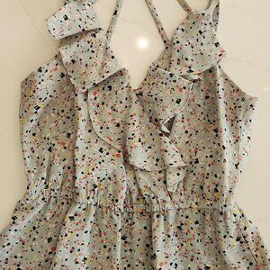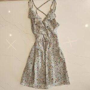 BCBG Y2K Babydoll Mini Dress fun confetti print, Flirty Ruffles, and Pockets. Light and breezy Criss-cross spaghetti straps and cinched waist for a flattering fit. Imagine twirling in this lightweight beauty for brunch or day out