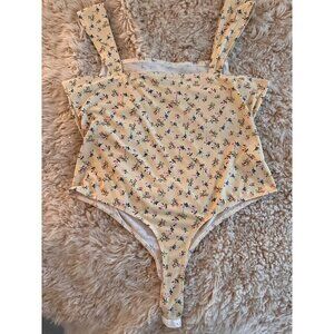 BCBG Yellow Floral Bodysuit Size L Pit to pit 18” Total length from straps to crotch is 28” I ship daily!