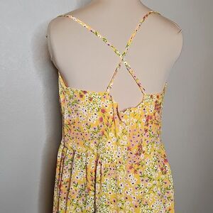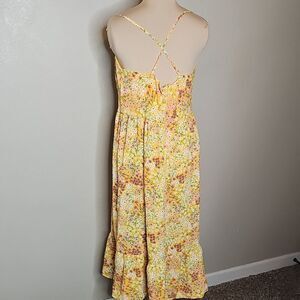 This sleeveless sundress by BCBG features a vibrant blend of yellow and orange hues, perfect for casual and resort wear. The ruched bodice with spaghetti straps adds a touch of elegance, while the lightweight fabric ensures comfort in warm weather. Its midi length and flowing skirt make it an ideal choice for sunny days. BCBG Yellow Orange Floral Milkmaid Ruched Midi Sundress Large in excellent condition