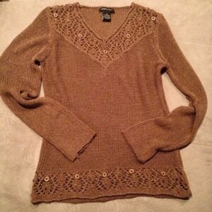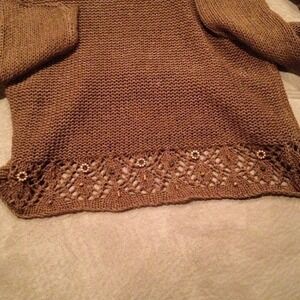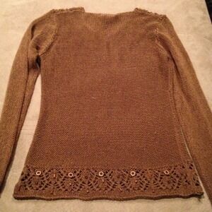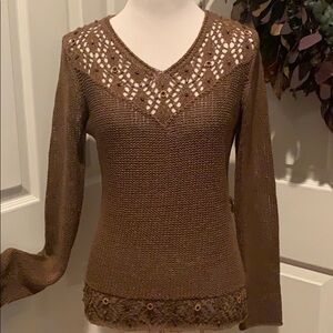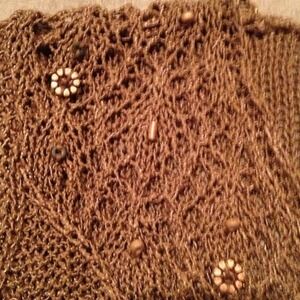 Brown knit with beading at neckline and waist. Great fit and style. Measures approximately 18 armpit to armpit and 23.5 total length.