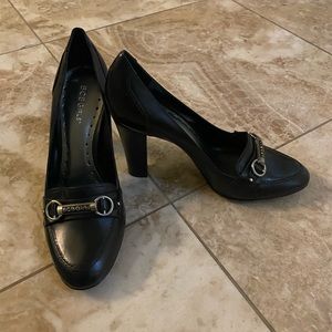 BCBG black heels. Wider heel is stylish and comfortable. Never been worn outside. In near perfect condition. BCBG adornment in front of shoe.