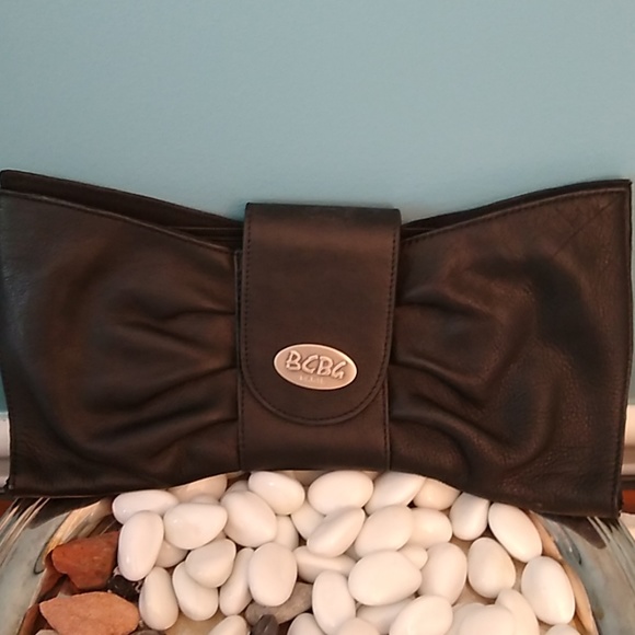 BCBG, black leather, bow clutch. Opens to center compartment, very clean, used condition.