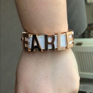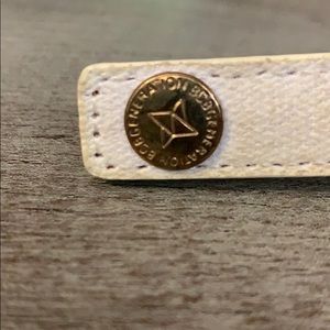 BCBG bracelet in white with rose gold letters spelling “Fearless”. Has a snap closure with two different settings. It is white leather with canvas like fabric on top. Since It is white It has some discoloration