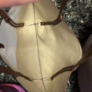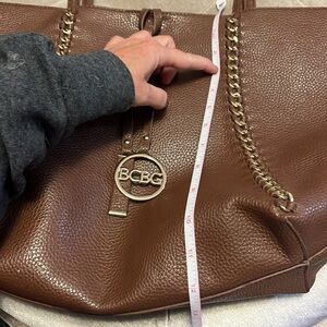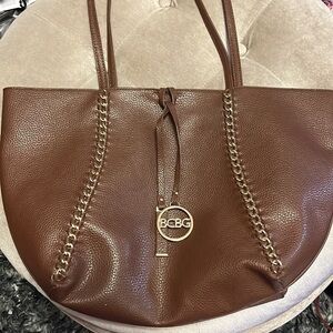 Gently used BCBG brown bag that features fake leather that is pebbled, gold braiding, and the BCBG gold logo pieces. The inside of this is an off-white, pebbled fake leather that is just a wide open space. This is a great, relatively lightweight bag that has nice shoulder straps that stay in place. It’s soft and pliable and can be used with a bag insert if you’d like to keep everything organized or if you just like the wide open space it’s perfect for that. No obvious flaws on the outside, just a couple of small of marks on the inside as it has been used gently.