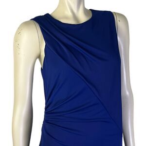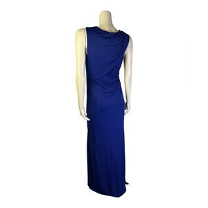 This floor length sleeveless sheath is a vision in Orient Blue from Max Azaria, featuring beautiful draping, which extenuates the natural curves of the body, and a sexy slit from thigh to the floor. It’s 93% Polyester and 7% Spandex, and the size medium measures as follows: